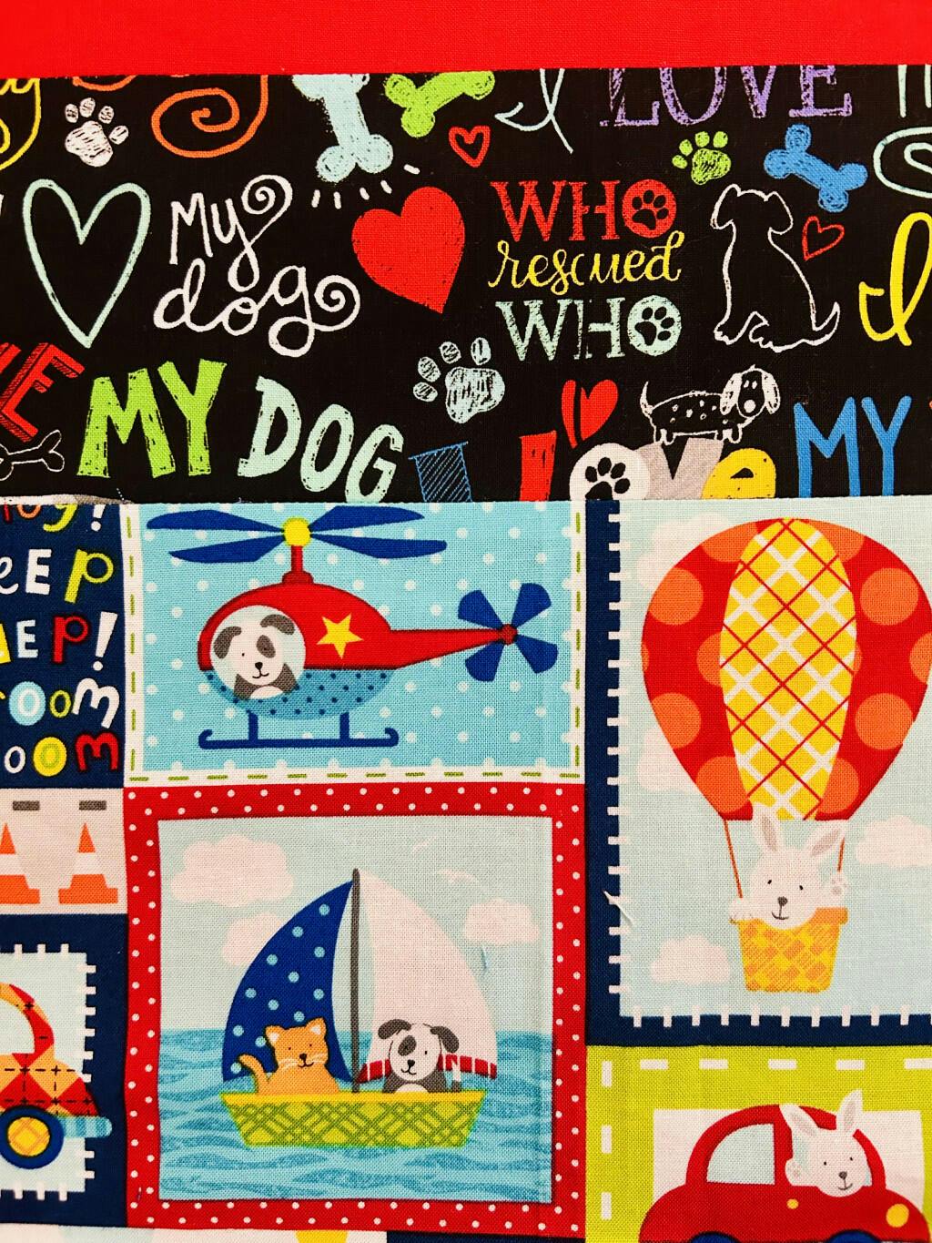This fabric is an ode to doggie love! Good quality and it doesn’t fray when cut. Even though I used it as a highlight strip in this baby blanket, it stands out.