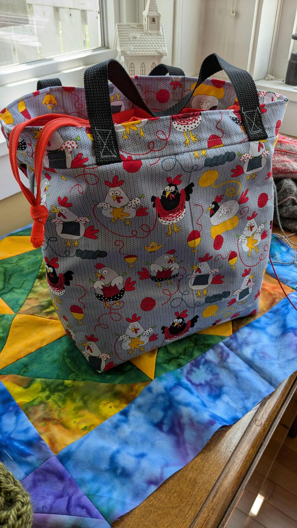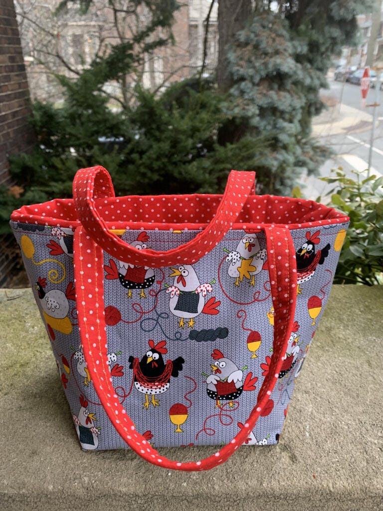 Knitting chickens are so much fun - and the perfect fabric for the Firefly Project Size Tote . Match with bright red cotton fabric.