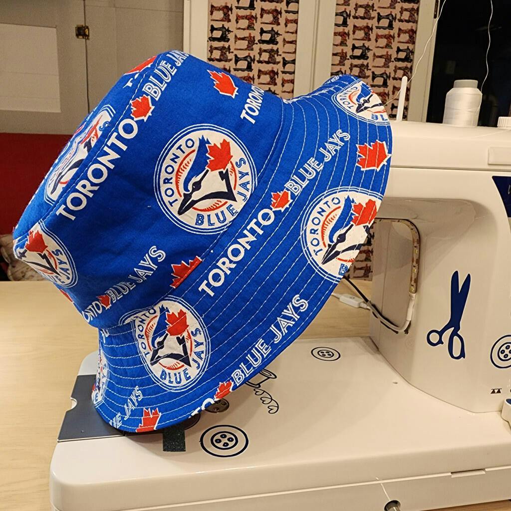 Couple of firsts happened.....went to my first Blue Jays game and made my first Bucket Hat (free pattern by Orange Bettie), it just so happened I combined the 2 firsts into one project! I pre-washed both fabrics so I can wash the completed hat and not worry about shrinking. The Blue Jays fabric softened up nicely but maintained all the lovely colours. Great fabric!