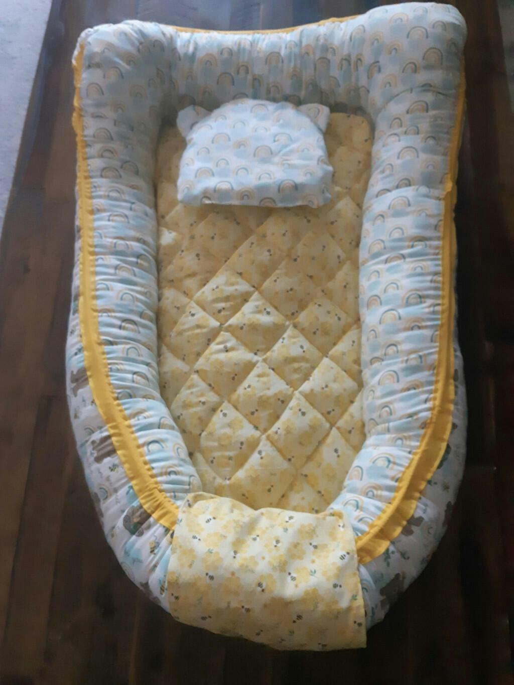 Well, my first grandbaby arrived last week and of course grandma had to make her a baby nest! We chose teddy bears (for grandma as teddy bears are my thing), rainbows (because she is a rainbow baby), and bees for mommy (mommy loves them!). I love how the three different fabric choices really compliment each other. Look how peaceful this little angel is in her baby nest. I think she loves it!