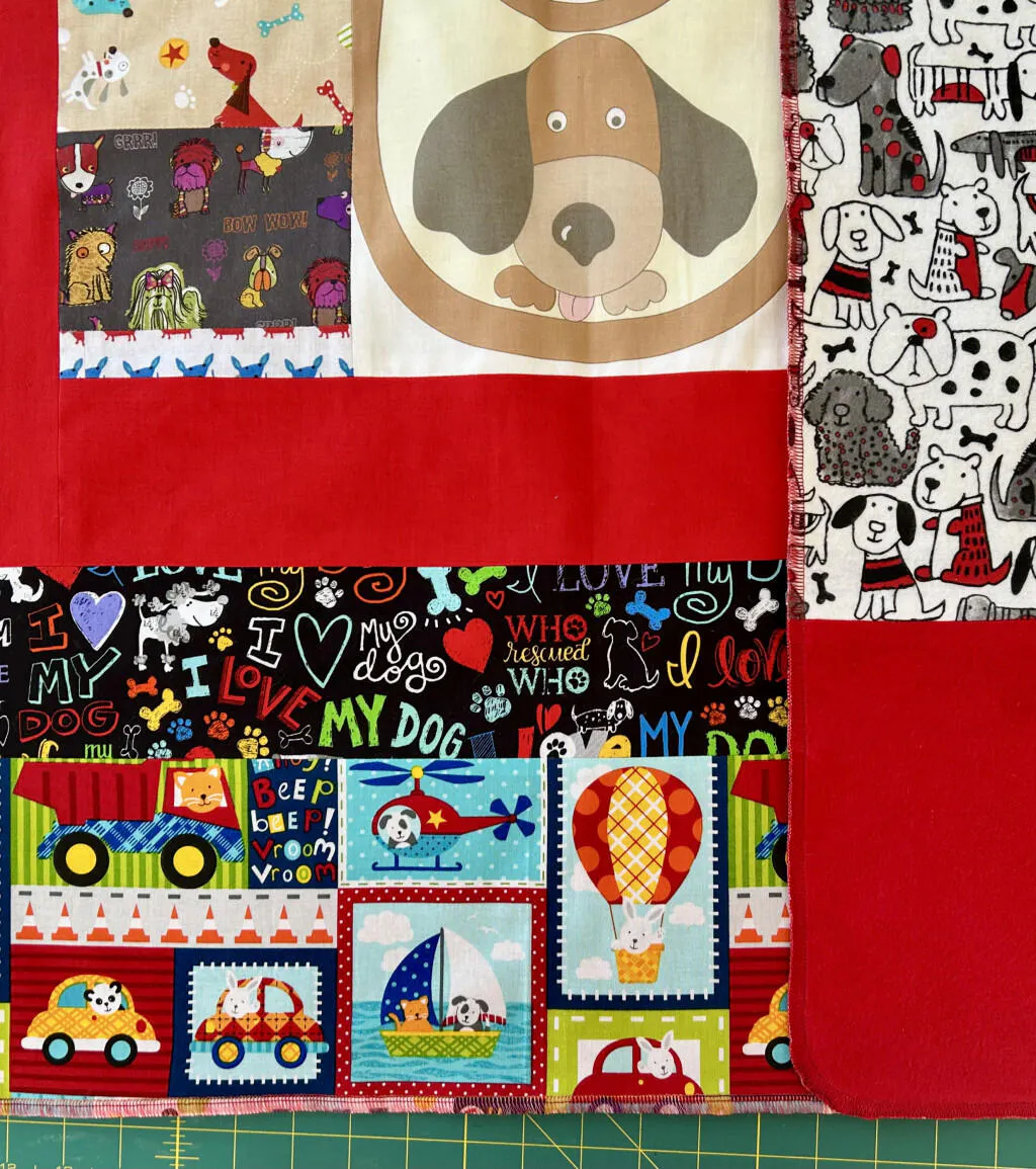 This fabric is an ode to doggie love! Good quality and it doesn’t fray when cut. Even though I used it as a highlight strip in this baby blanket, it stands out.