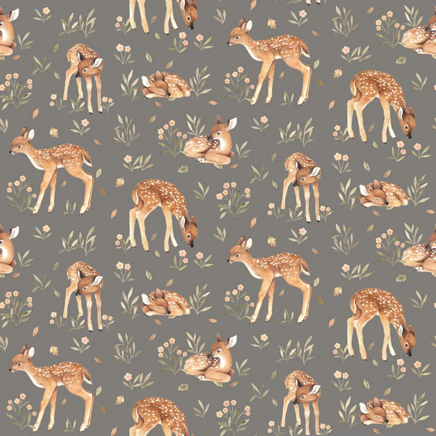 This charming fabric features a delightful woodland scene with adorable deer fawns frolicking amidst a backdrop of delicate flowers and leaves. The design is set against a soothing greenish/grey background, creating a serene and elegant look perfect for various crafting projects, from quilting to apparel. The fawns are depicted in various playful poses, adding a whimsical touch to the fabric, which is ideal for both children's and adult-themed projects.
