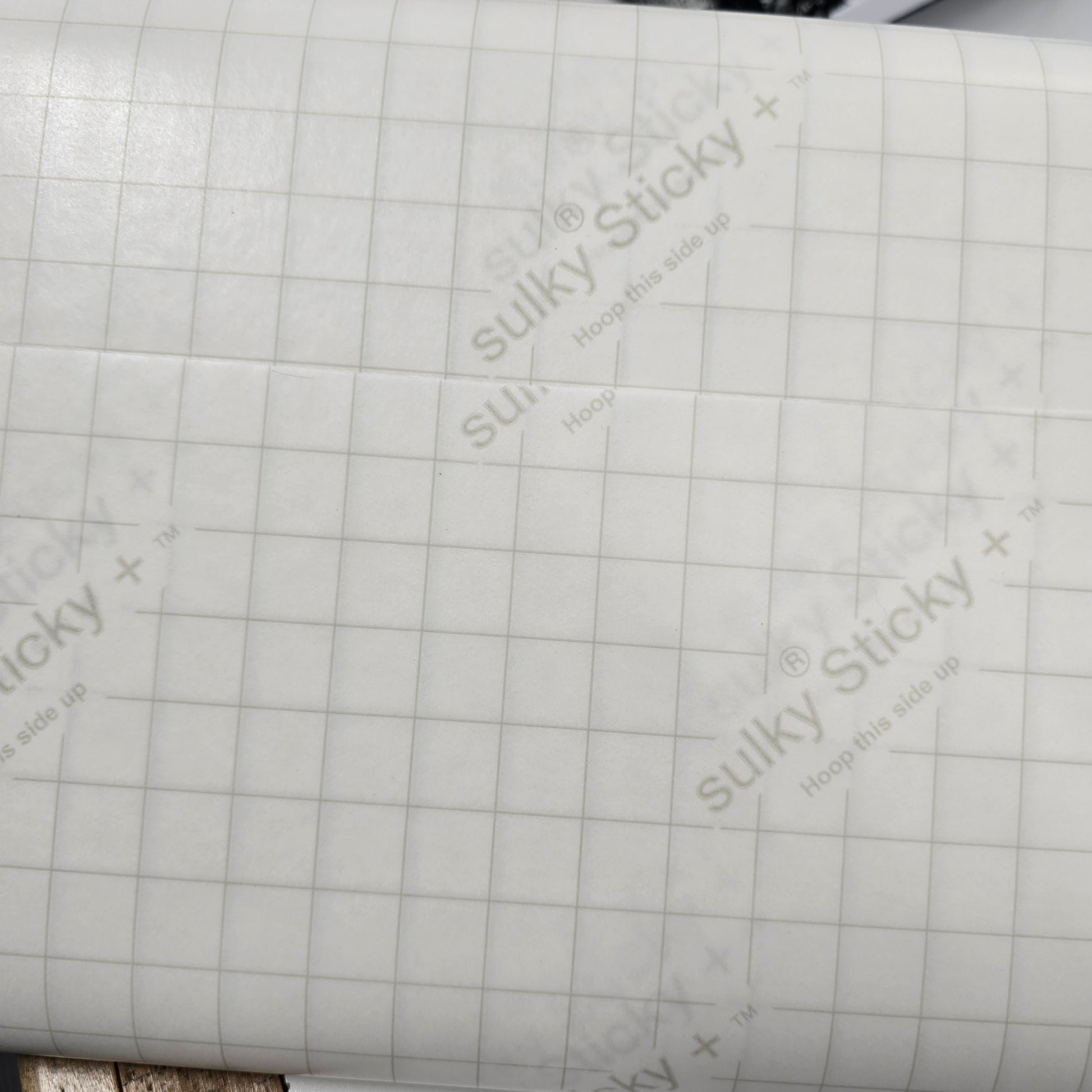 Sulky Sticky+ stabilizer is a temporary, self-adhesive, tear-away stabilizer that is ideal to use on items that cannot be hooped or are too small to fit in a hoop. Great to hold small areas like pockets, edges, cuffs, collars, etc. It eliminates hoop marks on fabrics like sweatshirt fleece, Ultra Suede, velvet, brushed velour, brushed denim, silk, flannel, knitted fabrics and caps. All Sulky stabilizers are acid and lead free!