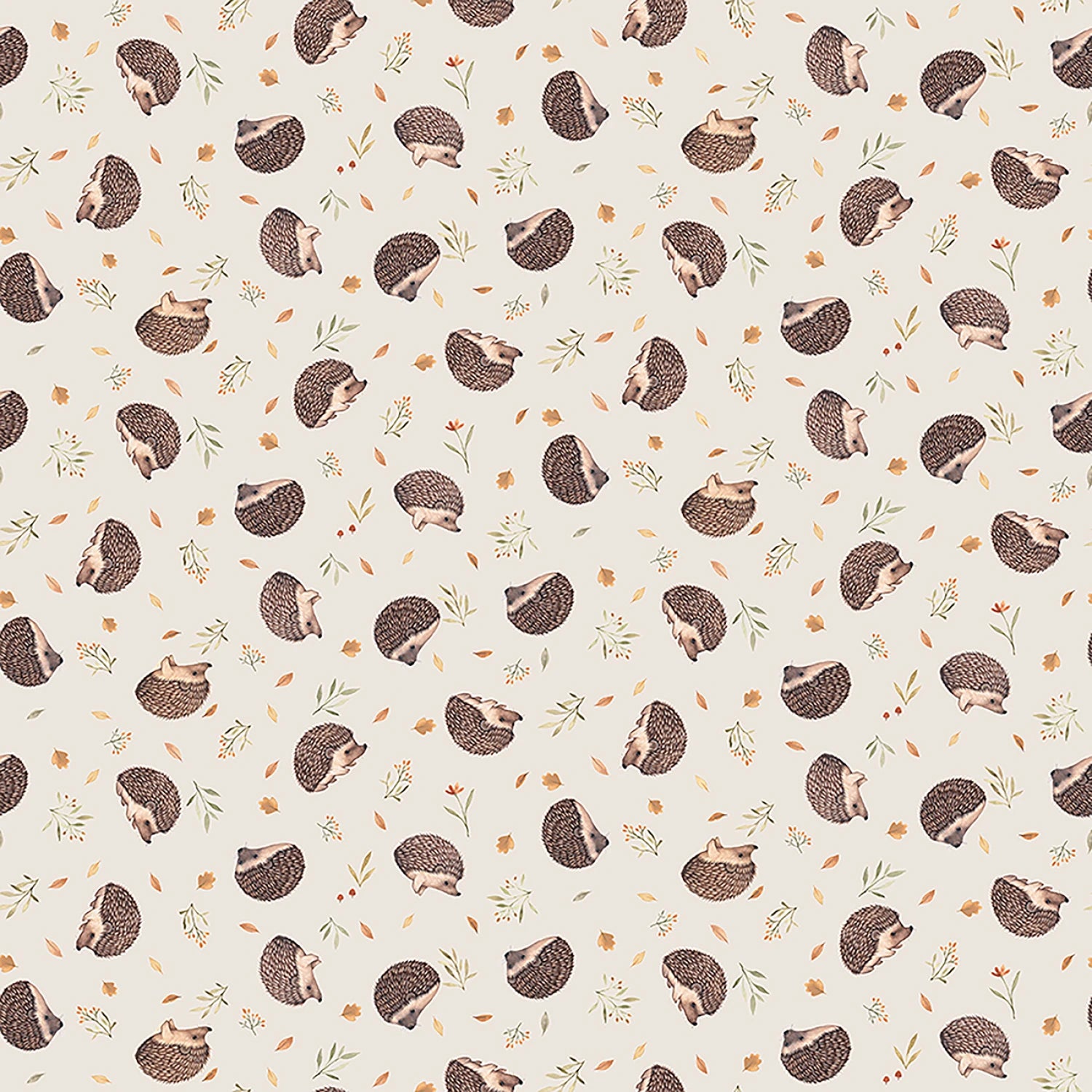 This charming fabric features a delightful pattern of taupe-colored hedgehogs scattered across a light beige background, interspersed with small floral and leaf motifs. The design evokes a whimsical, nature-inspired aesthetic, perfect for projects that require a touch of woodland charm. Ideal for both B2B and B2C customers looking to craft unique items like children's clothing, home decor, or quilting projects, this fabric combines quality with a playful design.