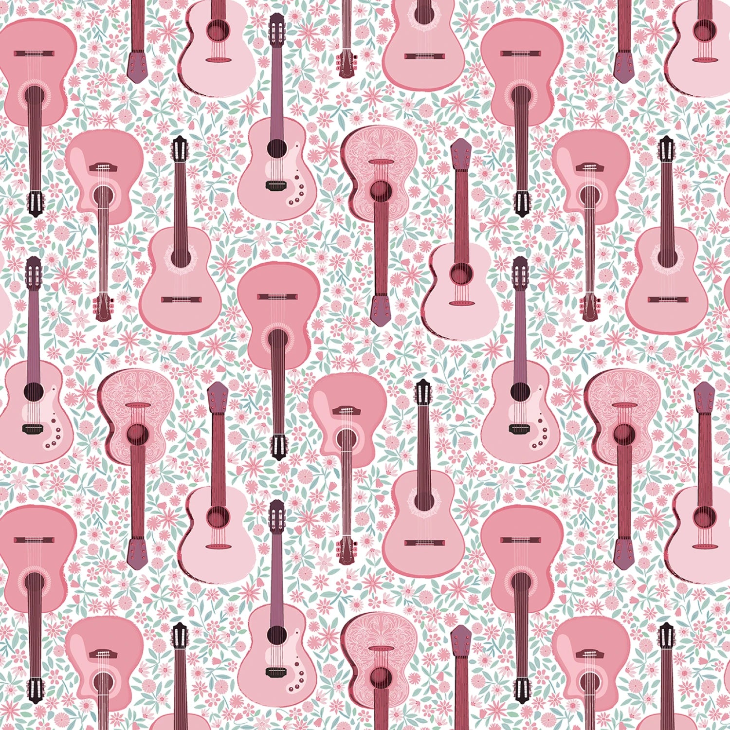 This charming fabric features a delightful pattern of pink guitars scattered across a light background, accented with delicate floral motifs. The design evokes a whimsical, musical vibe, perfect for projects that need a touch of creativity and fun. This fabric can be used in a variety of applications from quilting to fashion, bringing a unique and playful aesthetic to any creation.